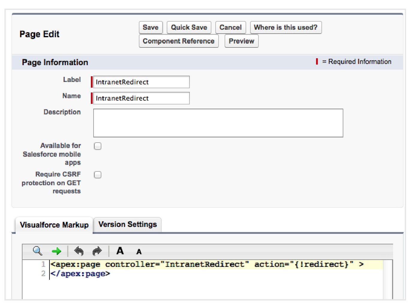 - From the Visualforce Page list, select intranetRedirect.