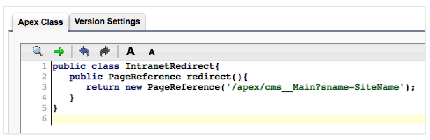 - On the Apex Class page, enter the following in the text box under the Apex Class tab, and replace SiteName with the unique site name that you entered when you set up your site. return new PageReference('/apex/cms__Main?sname=