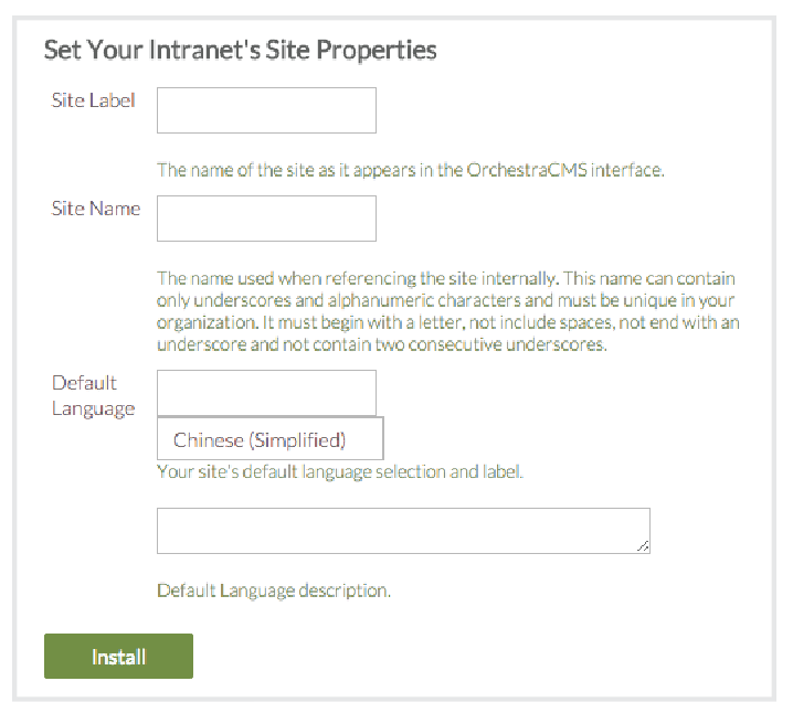- In the Site Label box, enter the name of your intranet, as it will appear in the OrchestraCMS interface.