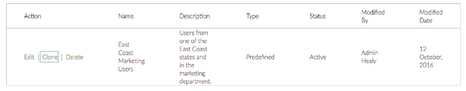 - Under the Action column in the target list, click Clone in the row of the target you want to clone. The target list displays a maximum of 100 targets at any time; you can filter the list by doing one or more of the following: