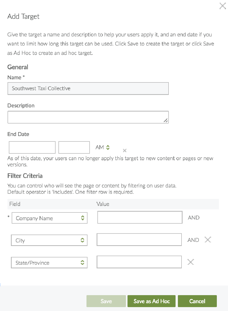 - Ad hoc targets allow the user assigning the target to define the values for the filter criteria fields at the time the target is assigned to content (for example, the Country field can be used to determine which users can access the item, and the user assigning the target can specify the users’ countries). Users can create a new target from scratch or clone an existing target.