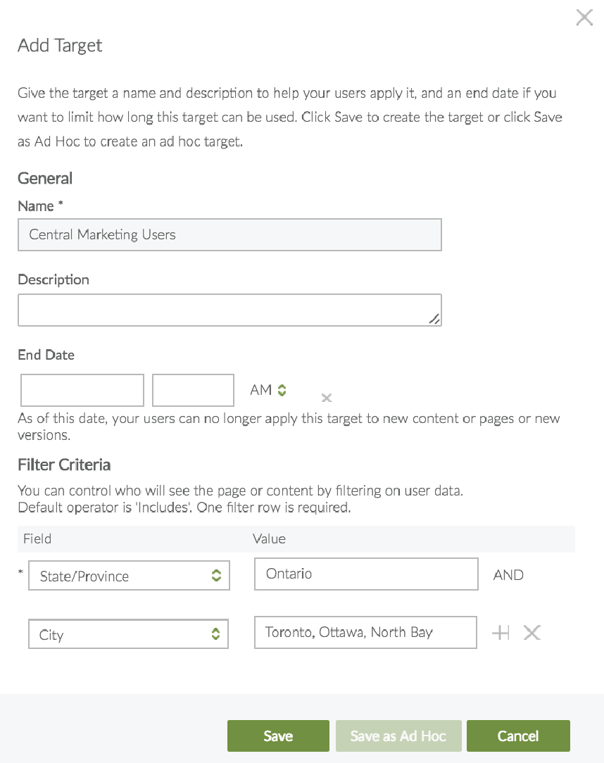 Ad hoc targets are used to allow the user adding the target to content to specify the value of the filter criteria fields. For example, an ad hoc target could contain the Country field to filter by, and the user assigning the target would specify, when the target is assigned, the countries that should have access to the content. To create an ad hoc target, the administrator selects the filter criteria fields but does not specify the field values; the values are specified at the time the target is applied to content.