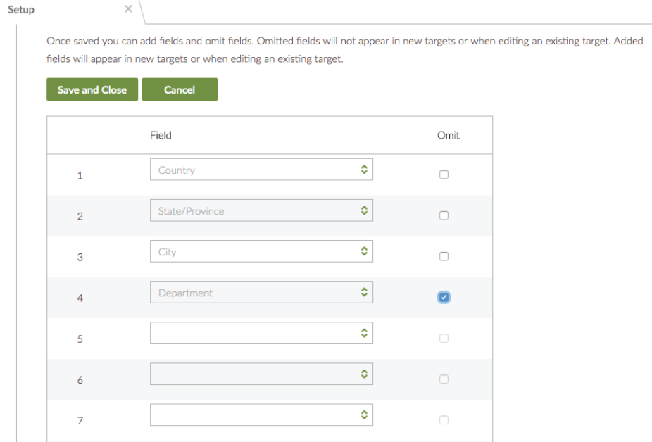 Once a field has been added to the list of filter criteria fields, it can’t be removed, but it can be omitted, which means the field won’t appear as an option when a new target is created or when an existing target is edited.