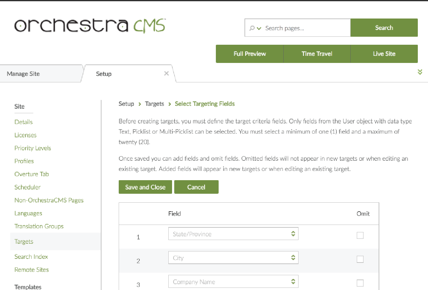 We recommend that you take time to plan which fields are needed for your organization’s current and future targeting requirements before you begin selecting fields in OrchestraCMS. Part of the planning should include evaluating your Salesforce User object to determine if any custom fields should be created for the purpose of targeting.