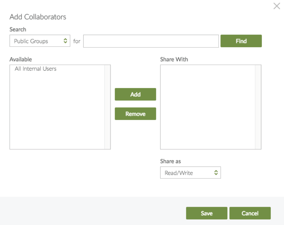 - In the Add Collaborators dialog, from the Search list, select how you want to add users. For example, you can add users by his or her public group or role, or you can add individual users (these options may be limited depending on your sharing permissions—restricted sharing only allows sharing with specified public groups). Your selection determines what is populated in the Available list, and you can choose to filter this list (Enter a search term and click Find).