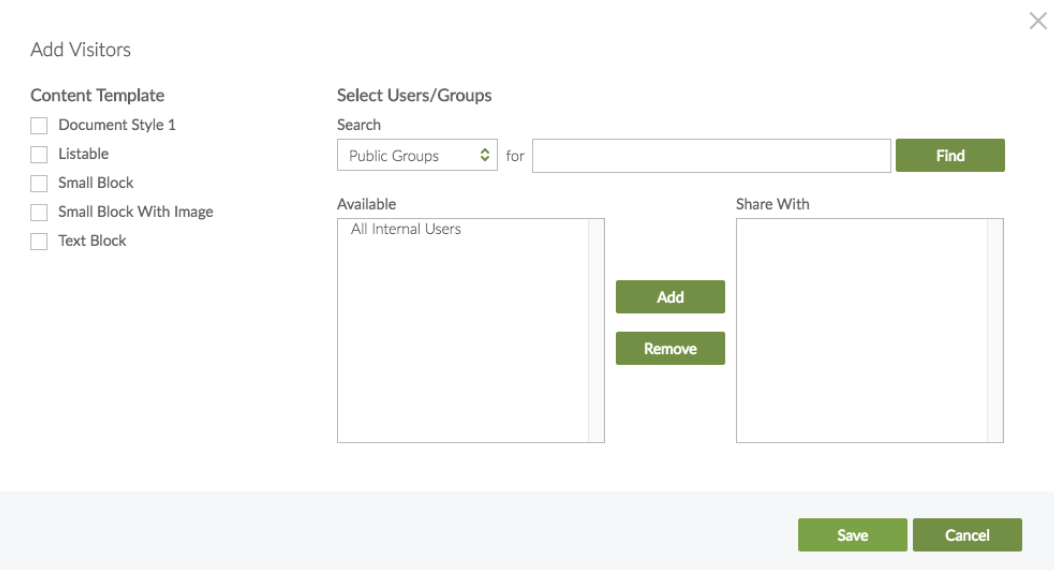 - Manual sharing to add visitors. Each content item and page can be manually shared with individual users or groups of users. This method is often used in conjunction with access levels to grant access in exceptional cases when the assigned access level does not provide access to all users that require it.