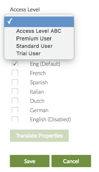 - Access levels. Each content item and page can be assigned one access level, which specifies which users have access to the content item or page. You can create and configure as many access levels as required for your organization.