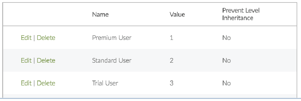 - In the Value box, enter a value to determine the placement of the access level in the access level hierarchy. The highest potential level of the hierarchy has a value of 0. Access Levels applied to content or pages are applied to all access levels higher in the hierarchy (if level inheritance is not disabled). For example, you could have an access level named “Premium User” with a value of 0 and an access level “Standard User” with a value of 1. Content with a Standard User access level applied will also be available to “Premium Users”. If you want each access level to be independent, you can disable access level inheritance (see below).