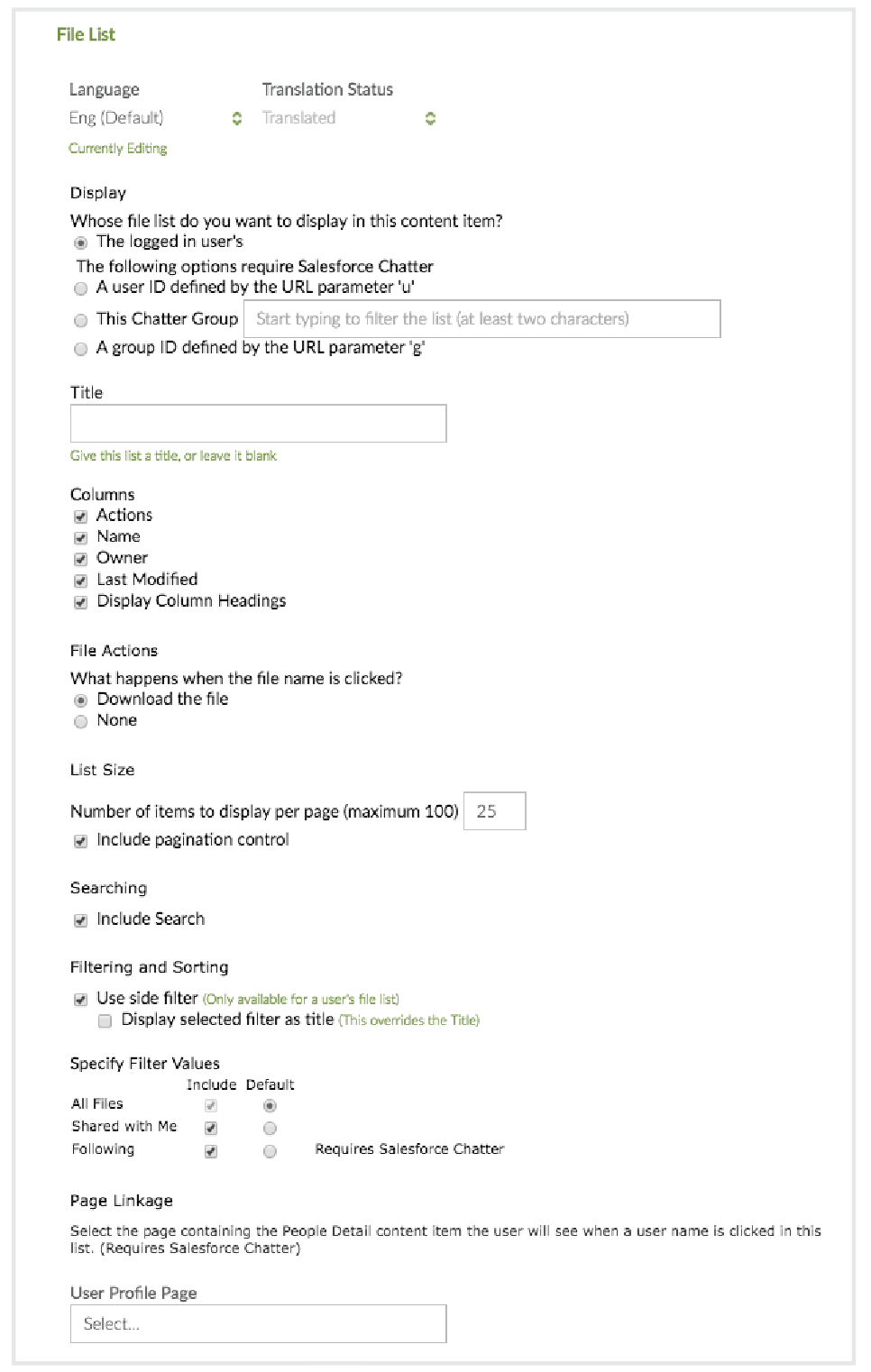 - Specify Filter Values. You can include All files (the default), Shared with me, or Following (requires Salesforce Chatter.)