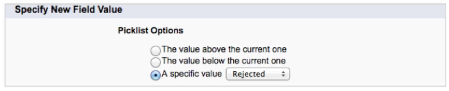 - In the Specify New Field Value area, click to select A specific value, and then select Rejected from the list.