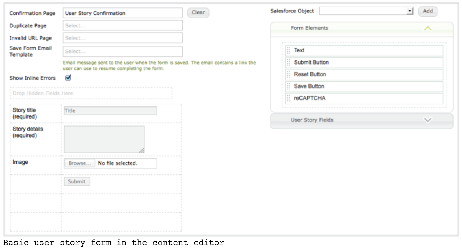The following procedure includes the minimum recommended steps for creating a user story submission form. Although you can add other elements to the form, it is not recommended that you include fields from other objects.