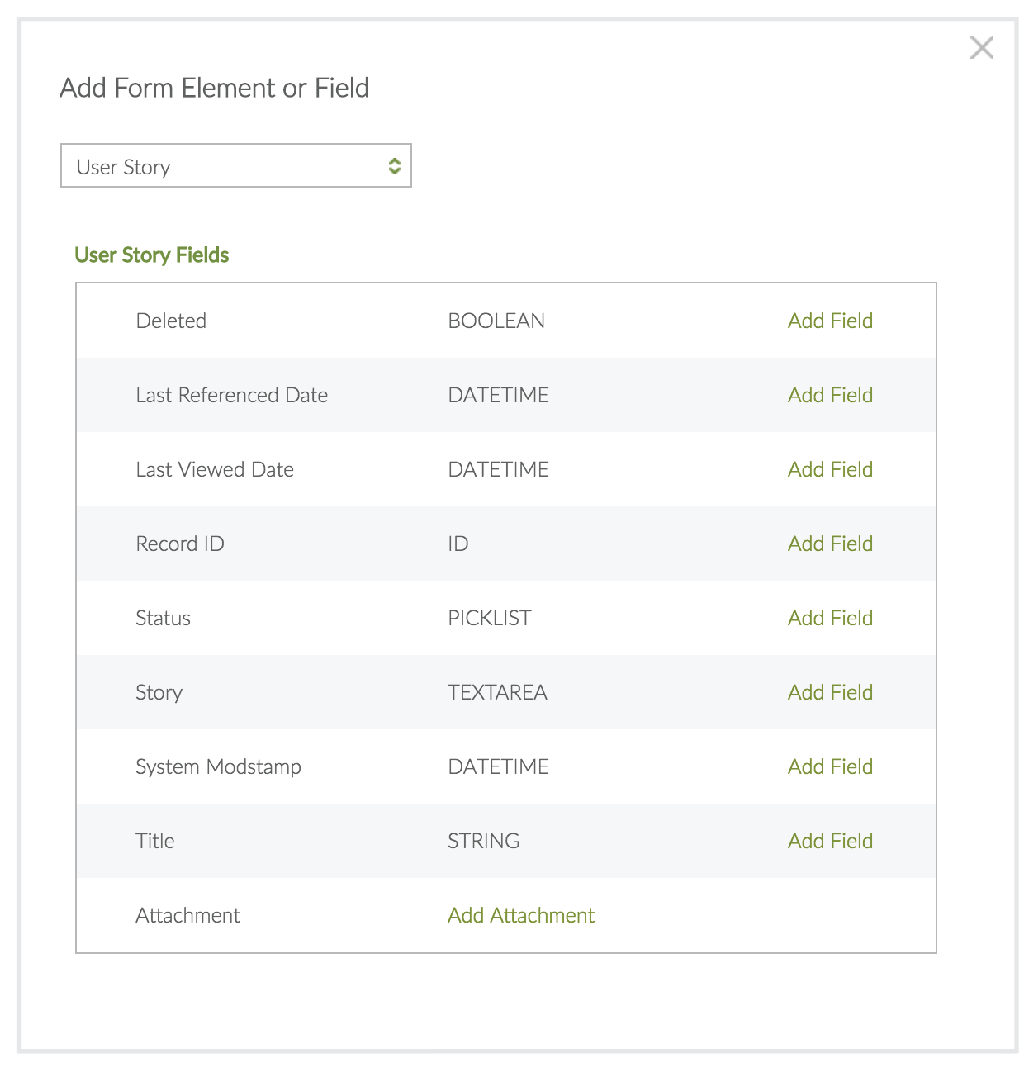 - Story. In the Add Field dialog, we recommend that you select the Required box to make this field mandatory.