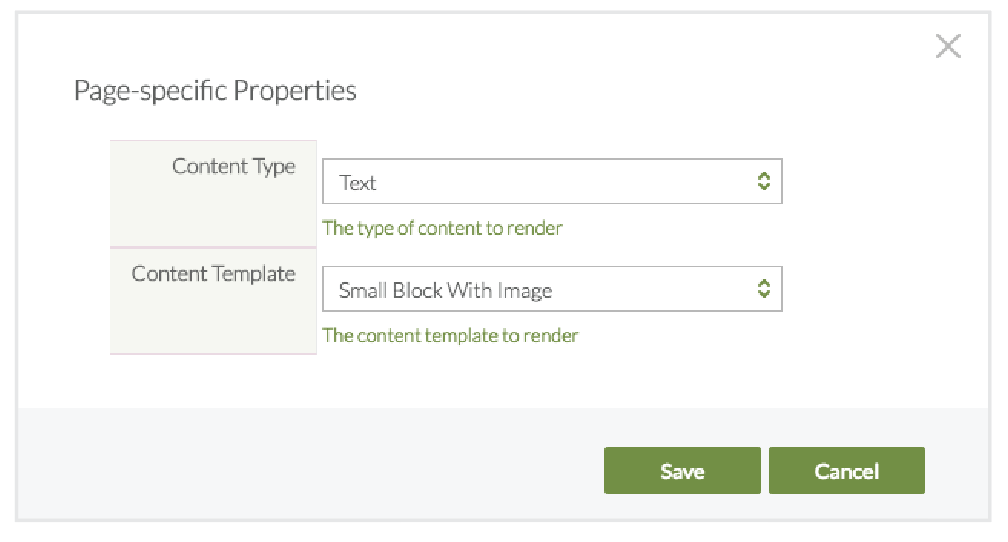 - In the Page-specific Properties dialog, select the content type and content template that you want to use to display content. This should be the same content type as the Document Style 1 content template that you are using to display content in the email notification, but it can be a different content template if that template is also associated with the content items contained in the email notifications.