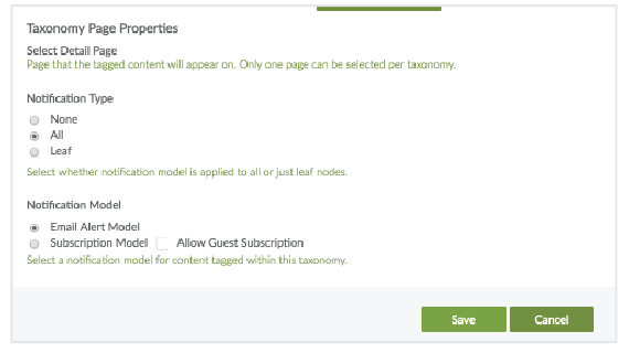 - For the Notification Type property, select either All or Leaf. The option All means that users can subscribe to all nodes in the taxonomy. The option Leaf means that users can subscribe to only the lowest level of child categories.