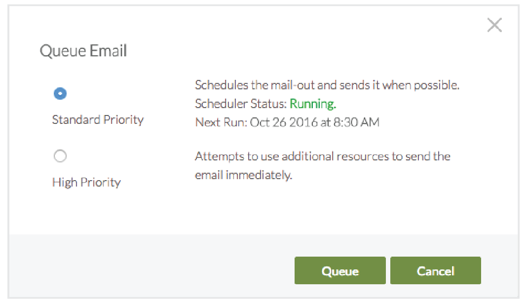 - In the Queue Email dialog, select one of the following priority options: