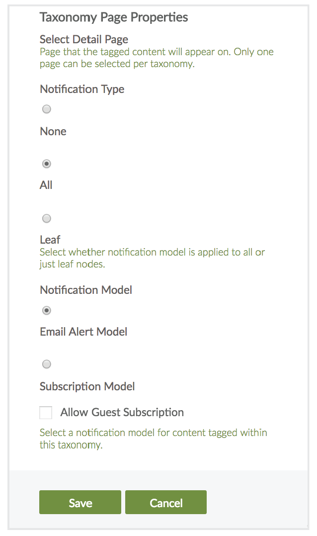 When you use a taxonomy for email publications or notifications, there are additional properties that must be set in the content editor for the Taxonomy Subscription content template. The subscription type and subscription model must be defined, and if you are allowing unauthenticated users to subscribe, an email verification page must be associated with the taxonomy.