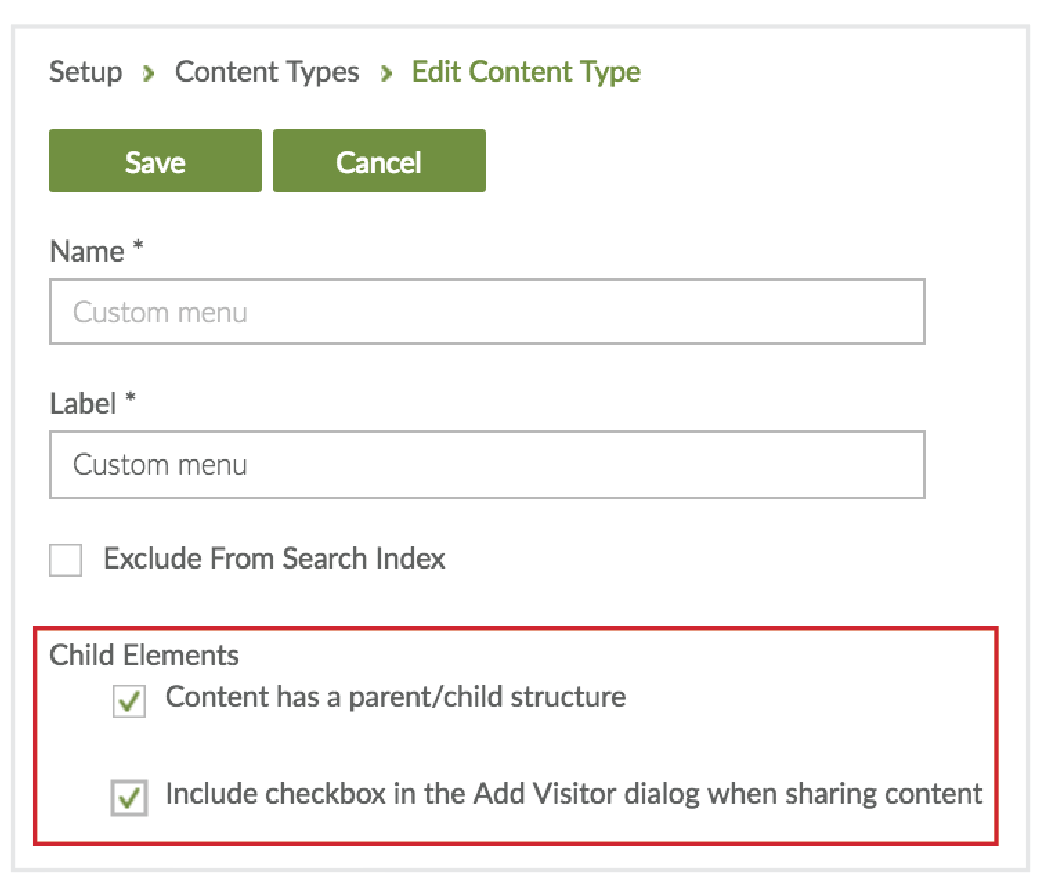 - There are two additional options related to child elements if your organization has private sharing and access levels enabled; these options are only applicable if the content type includes one or more menu content templates (i.e., Breadcrumb, Class Styled Menu, Mega Menu, Simple Horizontal Menu):