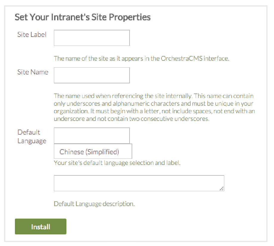 - Site Label. A descriptive label that will identify the site in OrchestraCMS. For example, a general corporate website could be labeled “Corporate.” A site dedicated to support could be labeled “Support.”