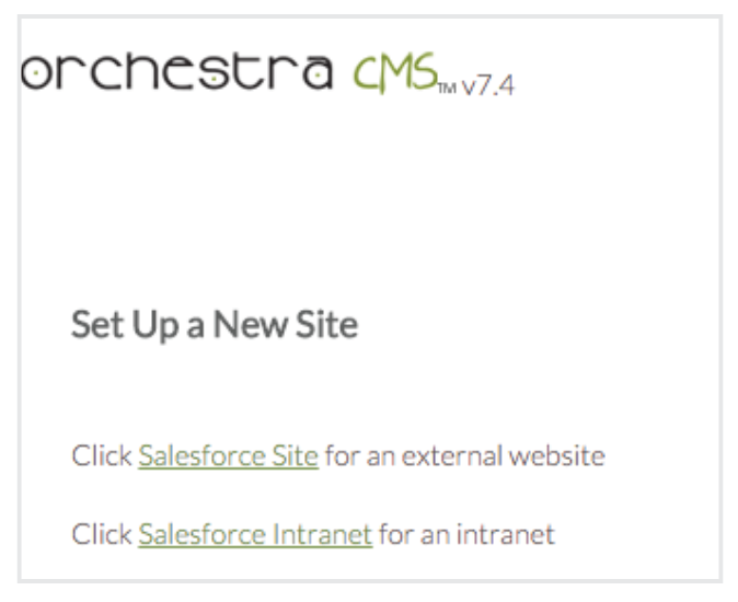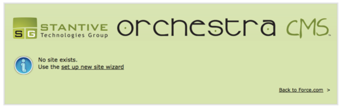 Each public site that you create and manage with OrchestraCMS requires a Force.com site. There is no charge to activate Force.com Sites. If you do not have access, contact your Salesforce representative to have Force.com Sites enabled for your organization.