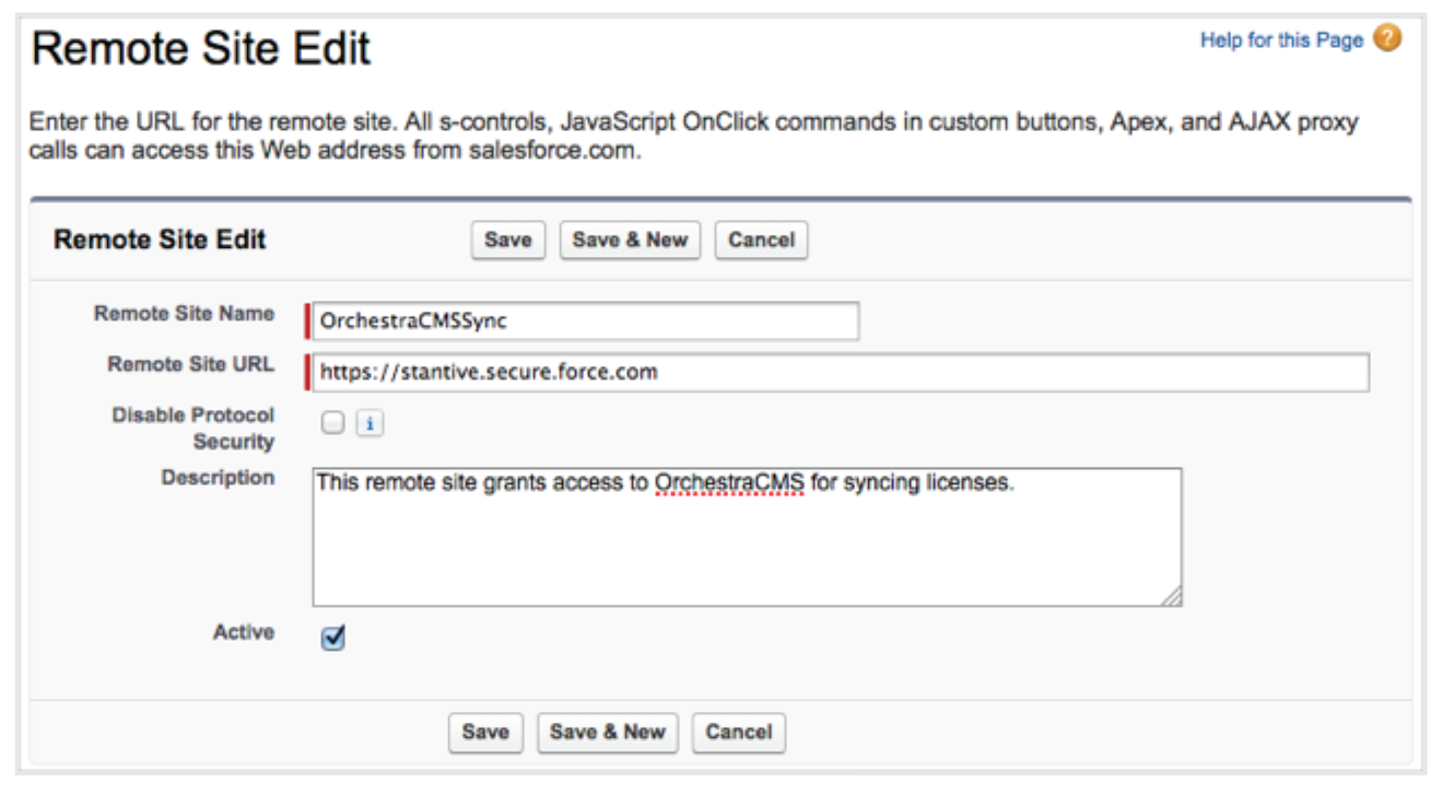 To sync OrchestraCMS licenses with your Salesforce organization, and to enable OrchestraCMS caching and other scheduled jobs, you must configure four remote sites in Salesforce Setup.