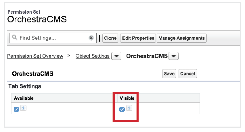 - On the Permission Sets page, locate the OrchestraCMS Permission Set.