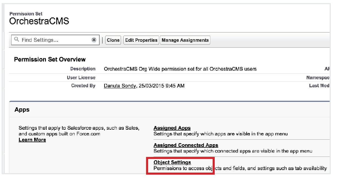 - On the OrchestraCMS Permission Set page, select Object Settings.
