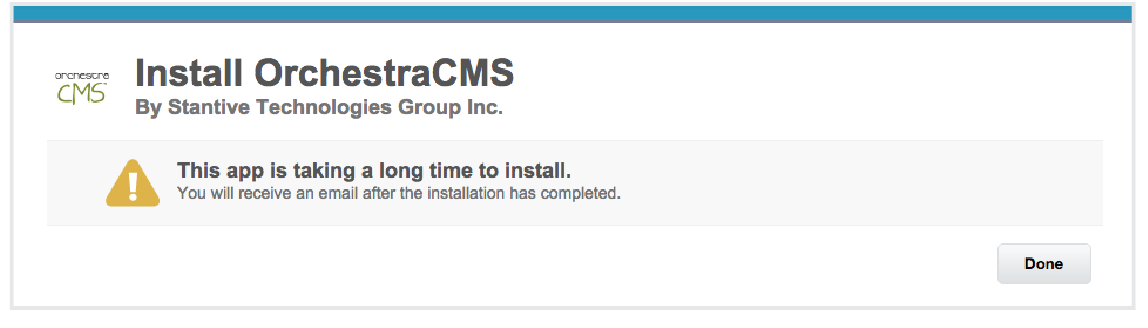 - When the installation process has completed, you will receive a confirmation email from Salesforce.com. Wait until you receive this email before completing the upgrade in OrchestraCMS.