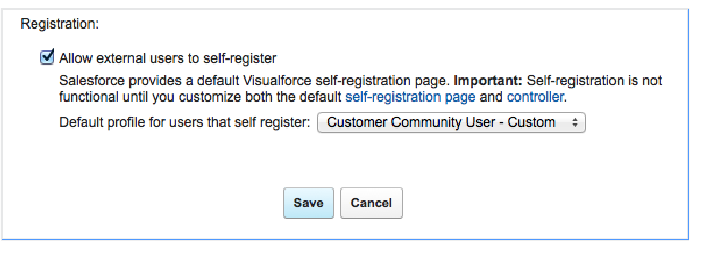 - Select the default profile for users that self-register. This must be a profile that can access the community; however, you may choose to create a custom profile that is attached to a community license specifically for this purpose.