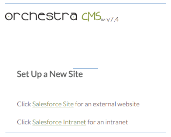 - If your organization does not currently have a site added to your OrchestraCMS installation, you are directed to a page that instructs you to set up a new site. Click Set Up New Site.