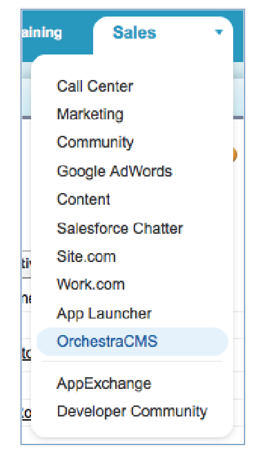 - From the Force.com app menu, select OrchestraCMS.