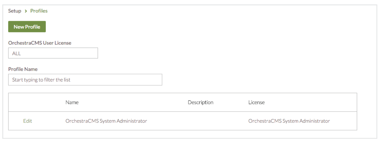 Each OrchestraCMS profile is associated with an OrchestraCMS license type. Every user added to an OrchestraCMS profile is assigned the associated license type.