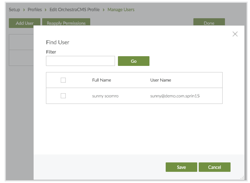 - In the window that appears, click to select the Salesforce users that you want to assign to the OrchestraCMS profile, and then click Save.