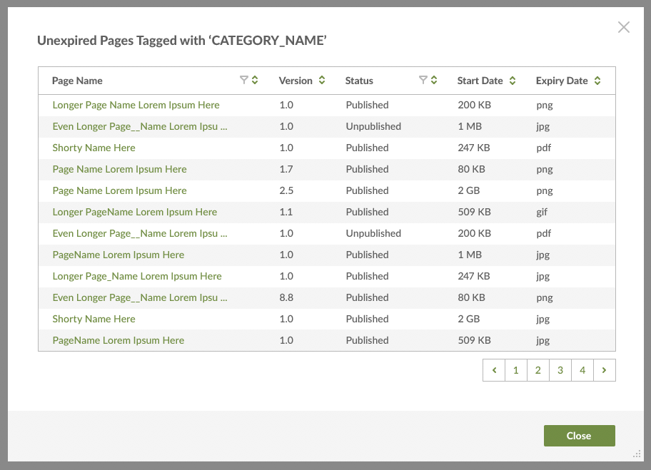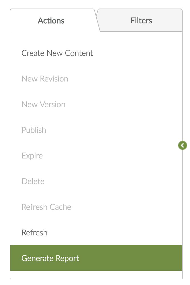 You can generate a report based on all Content or Pages in a list; or, using the Filters panel, you can first filter your list to include only certain Content or Pages — for example, published or expired items.