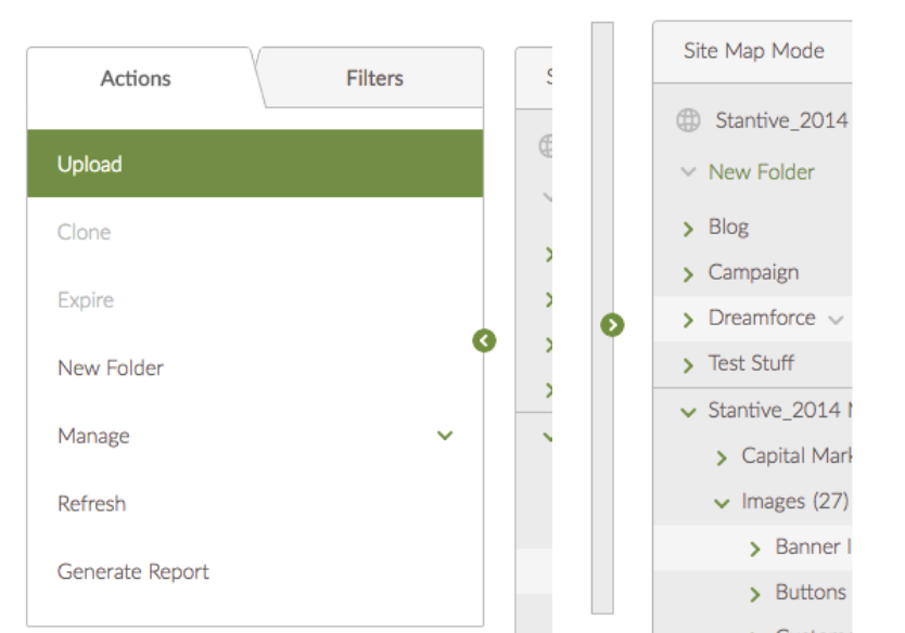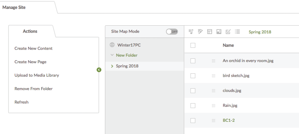 There is a new section within the Manage Site Sidebar for folders. You can create and manage a hierarchical site folder structure for Content, Pages, Media, Tasks and Approvals, where you can share folders, manage the sitemap, manage media library folders, and preview certain kinds of media.