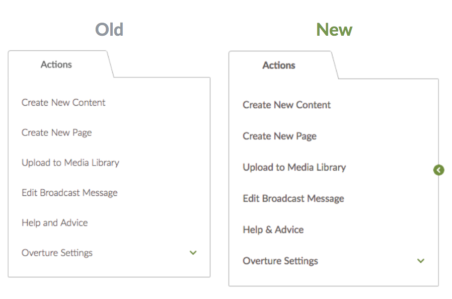 Overture, Pages, Content, Media, Tasks, and Approvals are now sections (rather than tabs).