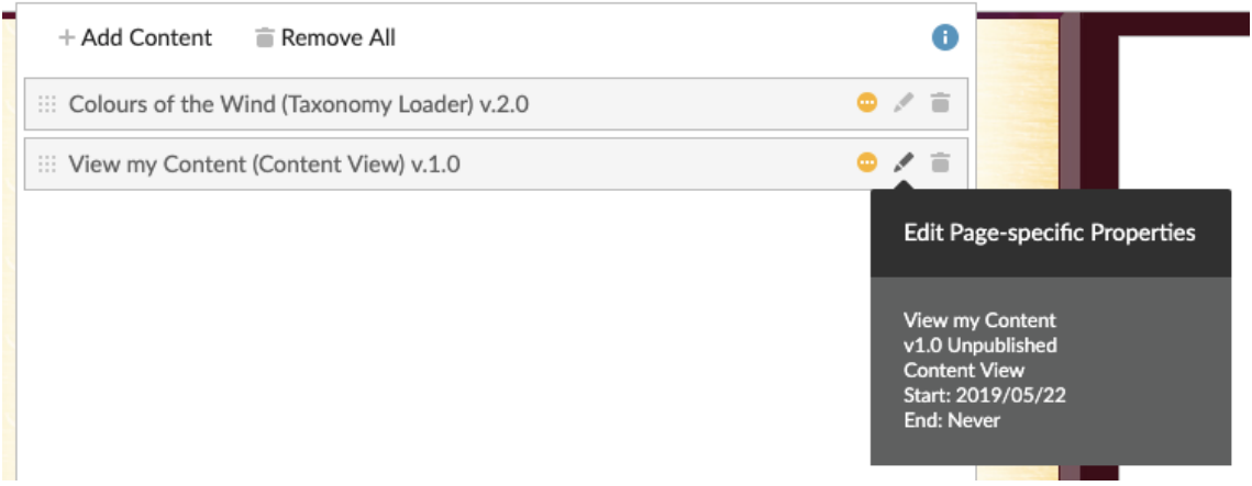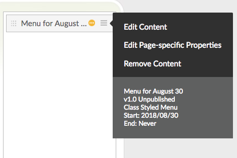 When you place a piece of content on a page, you will see new icons, including a drop-down function that allows you to Edit Content, Edit Page-Specific Properties, or Remove Content. It also shows you relevant information you might want to know about that piece of content.
