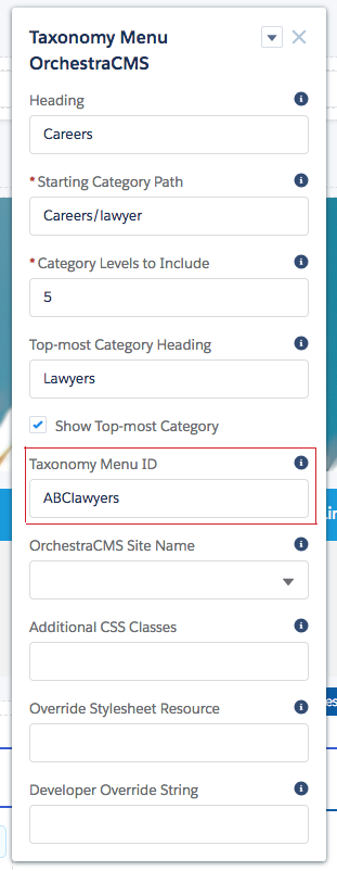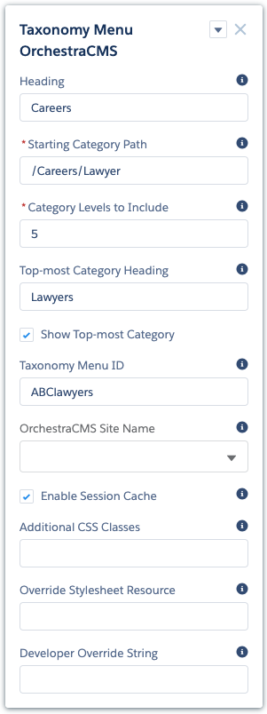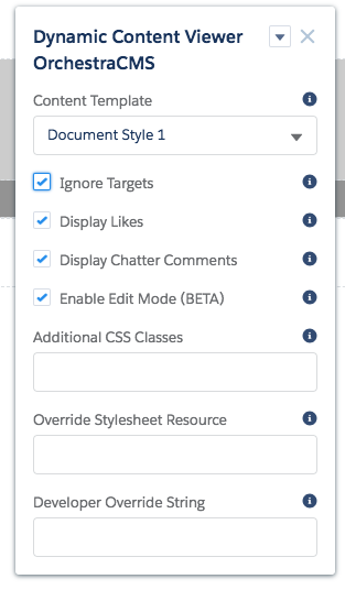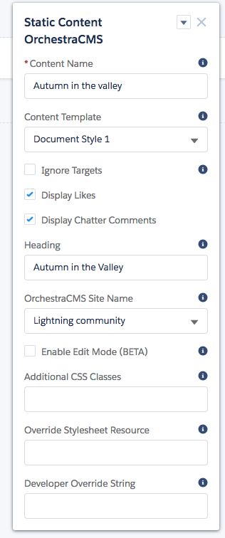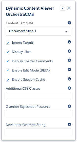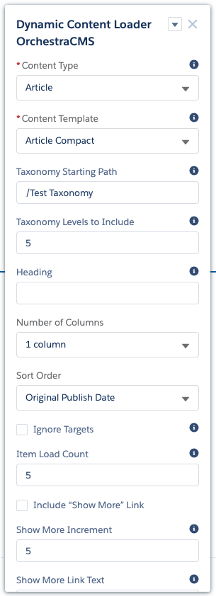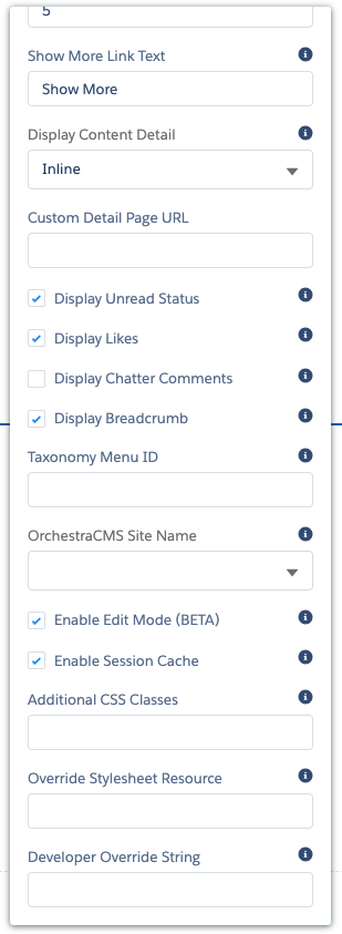 - This reveals a list of five OrchestraCMS Lightning components that you can drag onto your page. Each has properties to configure.