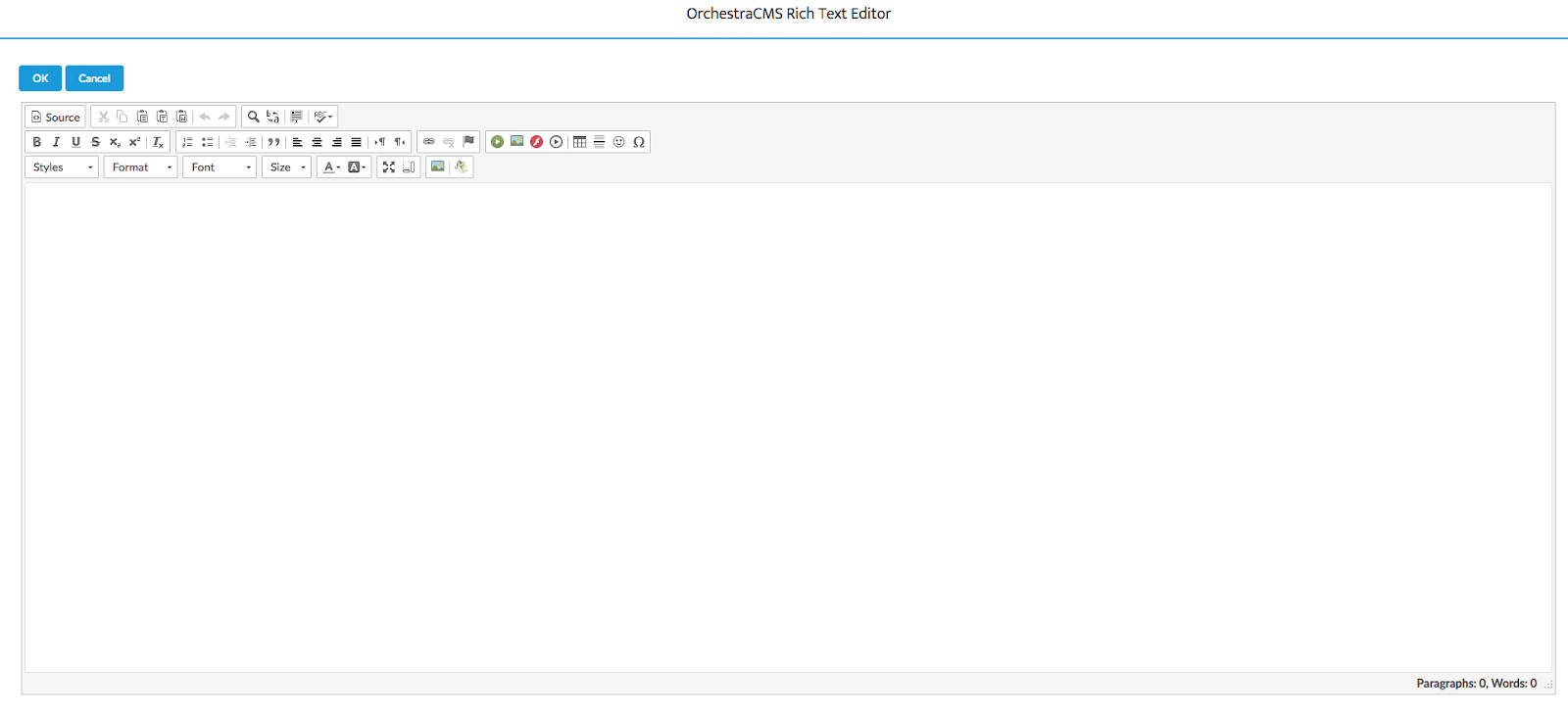 - When the appropriate user selects the Document or Rich Text section, a new window opens with a place for creating text and the OrchestraCMS Rich Text Editor.