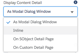 - Configure the Display Content Detail field so the content appears as a Modal Dialog Window, Inline, On an SObject Detail Page, or On a Custom Detail Page.